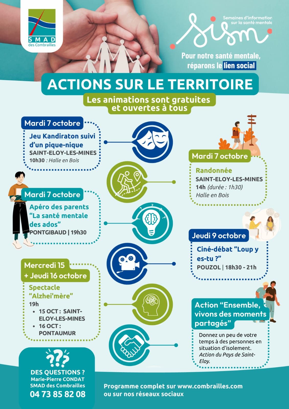 📅 Retrouvez le programme des SISM sur le territoire des Combrailles avec le soutien du SMAD des Combrailles, de l'Agence Régionale de Santé Auvergne-Rhône-Alpes et de nombreux partenaires locaux.